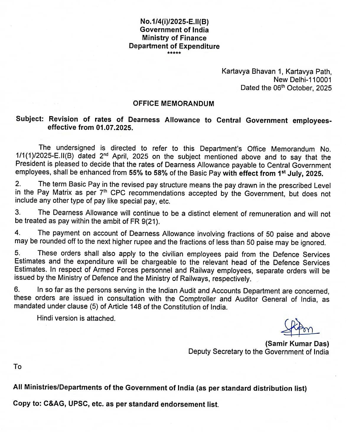 The undersigned is directed to refer to this Department’s Office Memorandum No. 1/1(1)/2025-E.II(B) dated 2nd April, 2025 on the subject mentioned above and to say that the President is pleased to decide that the rates of Dearness Allowance payable to Central Government employees, shall be enhanced from 55% to 58% of the Basic Pay with effect from 1st July, 2025.