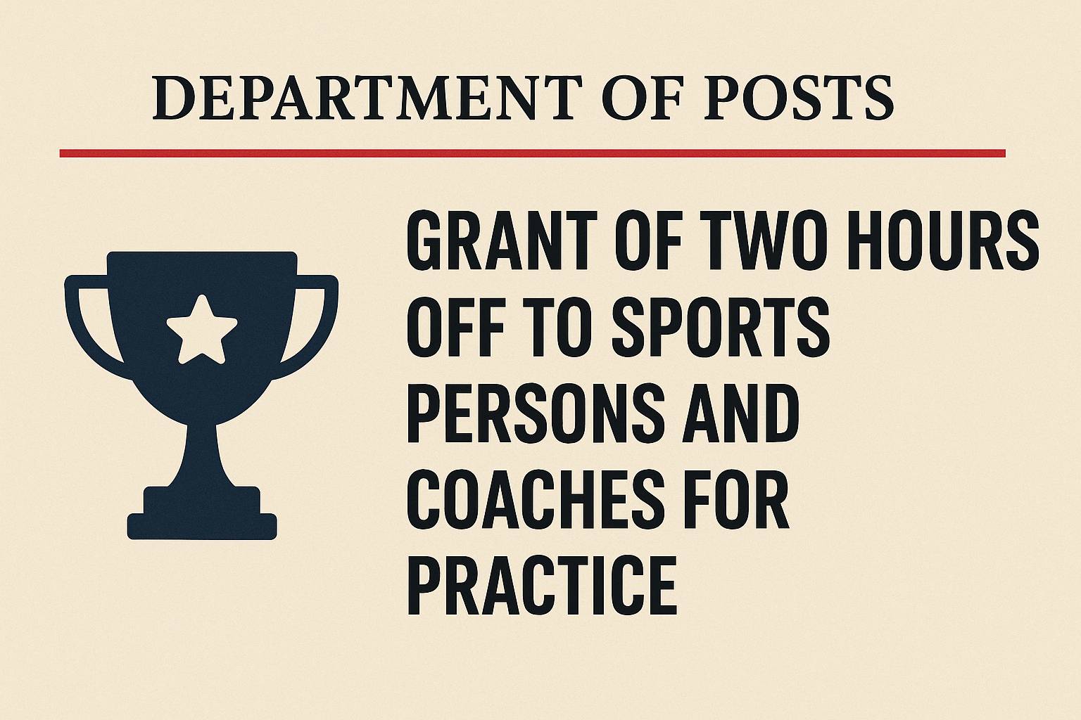 - Two hours off (i.e. two-hours lesser duty time from total number of duty hours per day) for practice may be granted to the players/coaches who are actively/regularly participating and performing in National/International Level tournaments aid are also participating in All India Postal Tournaments (if the same is conducted in that discipline).