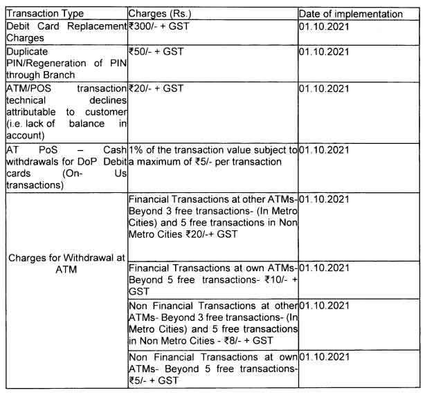 | Debit Card Replacement Charges | Rs 300+ GST | 01.10.2021 |