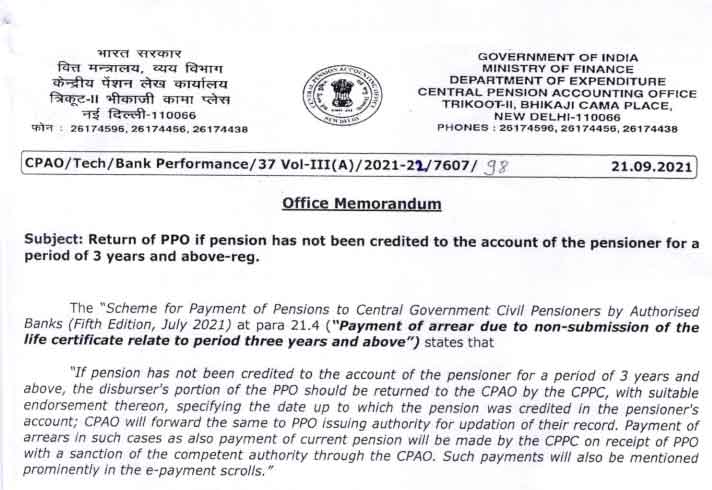 “If pension has not been credited to the account of the pensioner for a period of 3 years and above, the disburser’s portion of the PPO should be returned to the CPAO by the CPPC, with suitable endorsement thereon, specifying the date up to which the pension was credited in the pensioner’s account; CPAO will forward the same to PPO issuing authority for updation of their record. Payment of arrears in such cases as also payment of current pension will be made by the CPPC on receipt of PPO with a sanction of the competent authority through the CPAO. Such payments will also be mentioned prominently in the e-payment scrolls.”