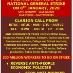 National General Strike on 08-01-2020 WORKERS OF INDIA – UNITE PREPARE FROM NOW ON NATIONAL GENERAL STRIKE ON 8TH JANUARY, 2020 SAVE ECONOMY — SAVE NATION SAVE PEOPLE — SAVE WORKERS CLARION CALL FROM INTUC — AITUC — HMS — CITU — AIUTUC — TUCC — SEWA — AICCTU — LPF — UTUC AND INDEPENDENCE TRADE UNIONS FROM Banks, Insurance, Postal, Railways, Telecom, Central and … [Read more...] about National wide General Strike on 08 January, 2020